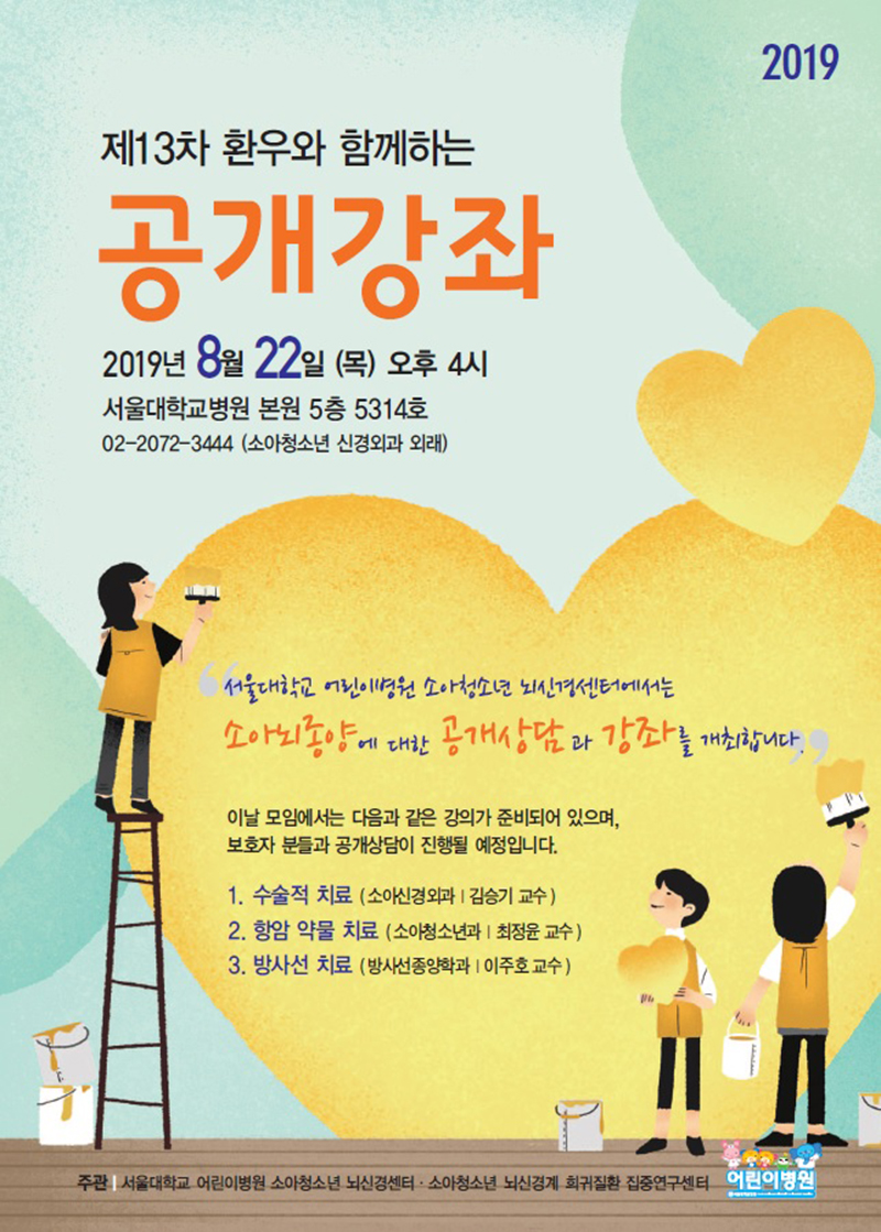 서울대어린이병원 소아청소년 뇌신경센터는 8월 22일(목) 오후 4시 서울대병원 본관 5층 5314호에서 소아뇌종양에 대한 공개상담과 강좌를 개최한다.