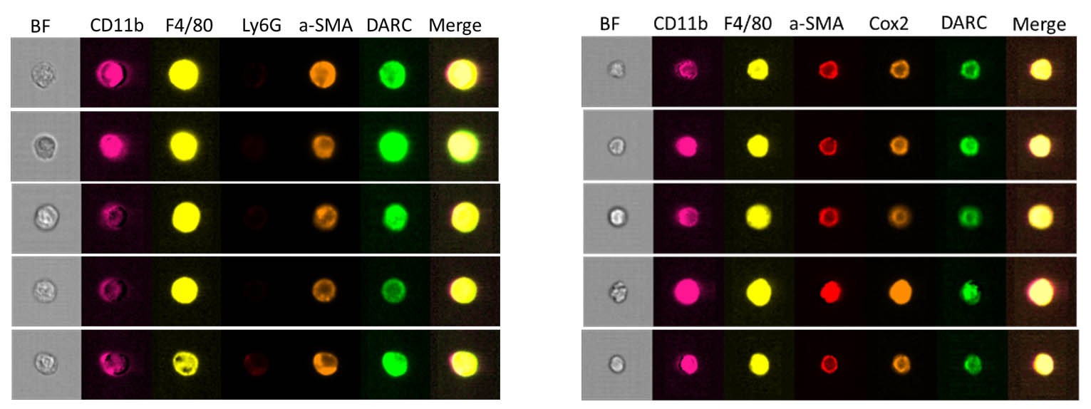 [Data 2] Confirmation of αSMA+COX2+DARC(ACKR1)+ monocytes/macrophages at the single-cell level (FACS single cell images by ImageStream)