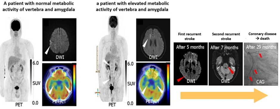 Afterwards, the patients who were discharged from the hospital were followed up to investigate the recurrence of stroke and vascular events (myocardial infarction, peripheral arterial disease, death). As a result, it was confirmed that patients with high metabolic activity in the amygdala and the lumbar vertebrae had a poorer prognosis than those with low levels.