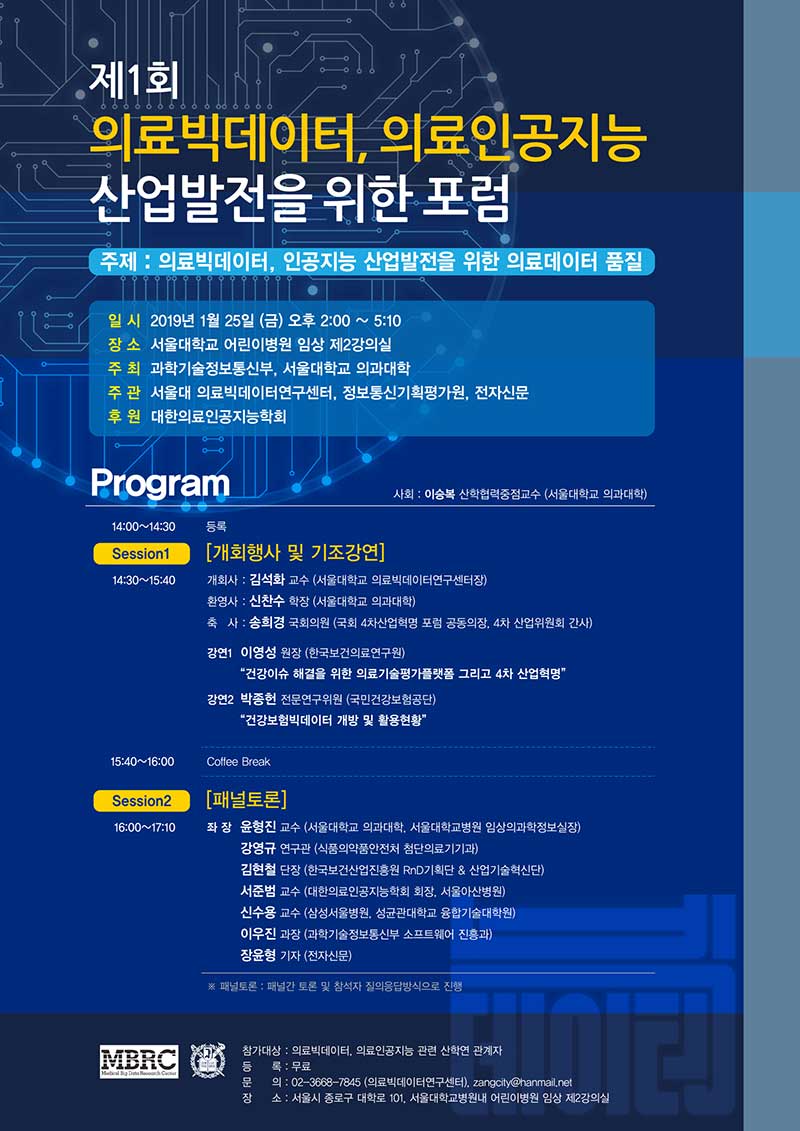 서울대 의료빅데이터 연구센터는 오는 25일 14시, 서울대어린이병원 임상 제2강의실에서 ‘의료빅데이터, 의료인공지능 산업발전’을 주제로 포럼을 개최한다.