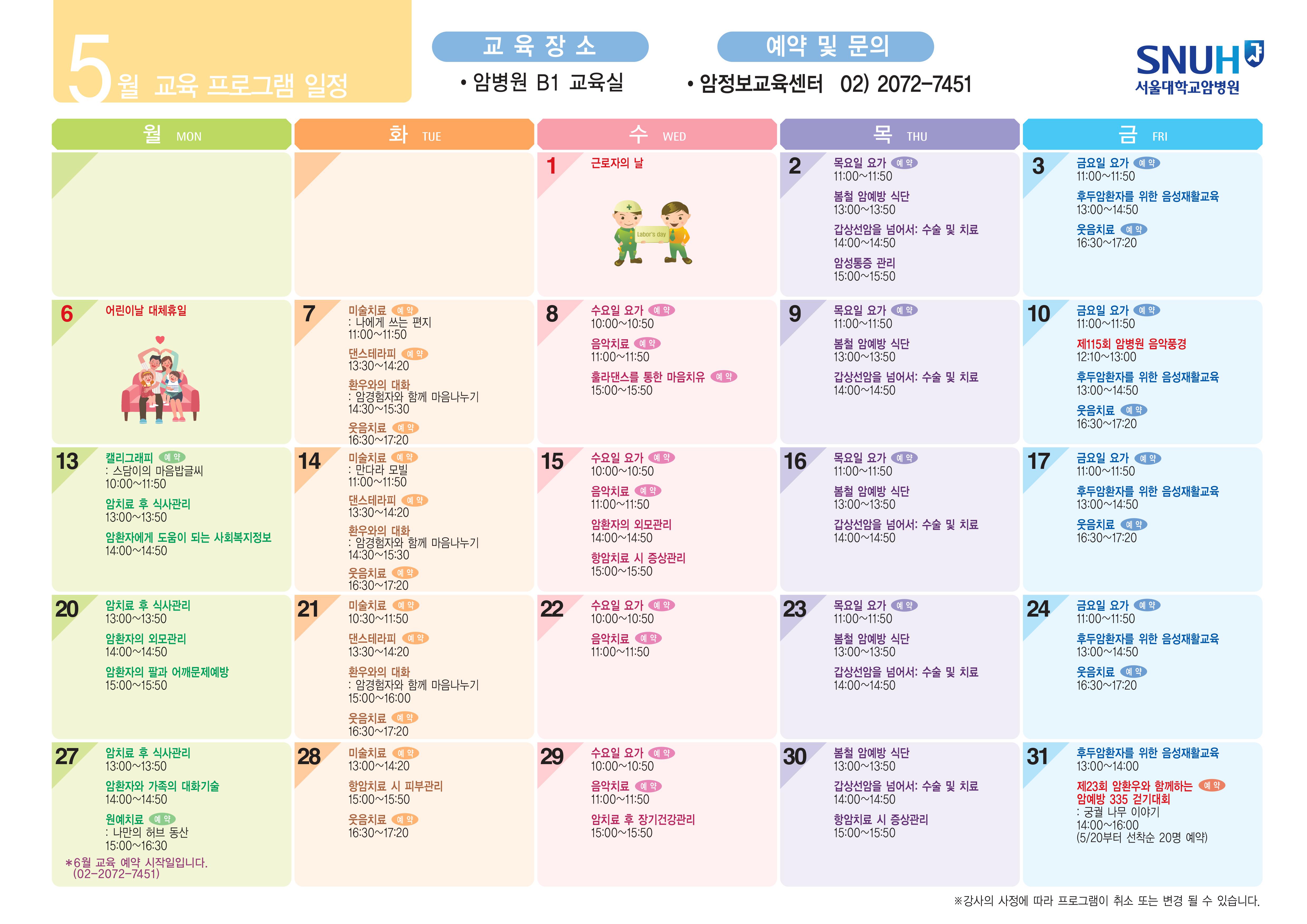 * 참여형 교육프로그램(예약 표기)은 암환자 대상 예약제로 운영되며, 매월 25일경부터 선착순 예약 가능합니다.