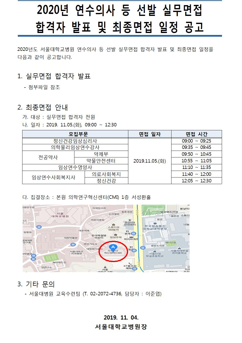 2020년도 연수의사 등 선발 실무면접 합격자 발표 및 최종면접 일정 공고
