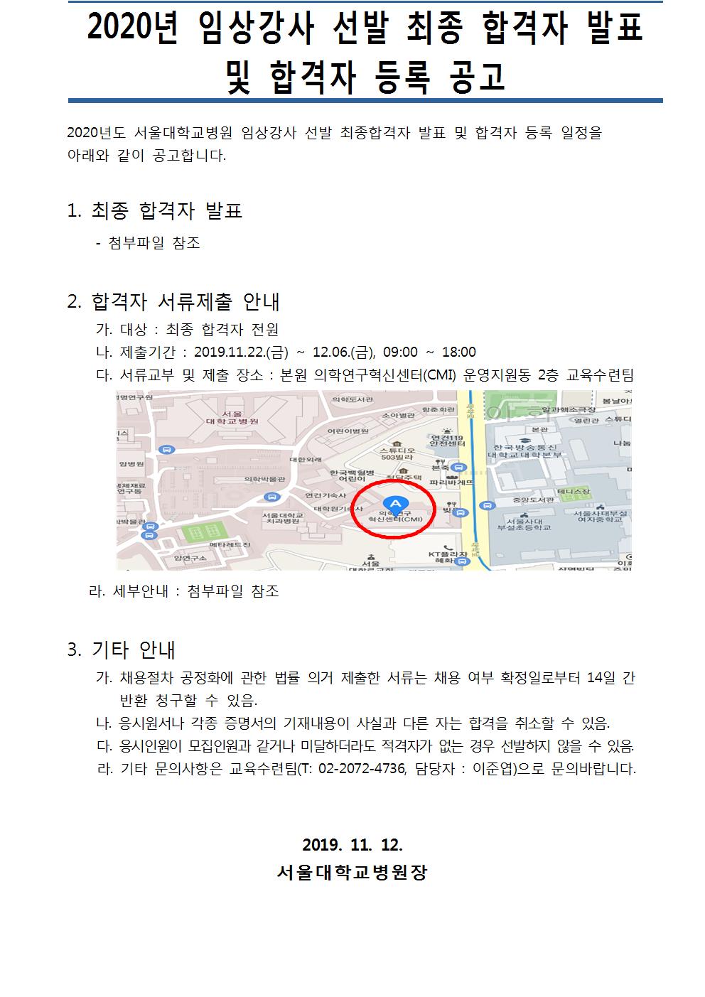 2020년도 임상강사 선발 최종합격자 발표 및 합격자 등록 공고