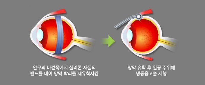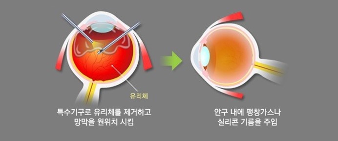 망막박리는 망막열공 등으로 인해, 안구 내의 가장 안쪽에 위치한 신경섬유층인 망막이 제 위치에서 떨어지는 것이다. 우리가 사물을 보는 것은 망막에 맺힌 상이 시신경을 통해, 뇌로 전달되어 시각이 형성됨으로써 가능하다. 그런데 망막박리가 발생하면 시야결손이나 시력저하 등을 초래하게 되고, 박리가 장기화되면 안구의 유지가 어렵게 되거나 실명에 이르게 된다. 공막돌륭술은 망막박리 치료를 위해 시행되며, 안구의 바깥쪽(공막)에서 실리콘 스폰지 등으로 안구를 압박하여 박리된 망막이 재유착되도록 하는 수술 방법이다. 유리체절제술은 검은 동자 주변에 미세한 투관침(Trocar)을 설치하고, 그곳을 통해 안구 내로 수술기구를 삽입하여 수술하는 방법이다. 유리체절제기를 이용하여, 안구 내를 채우고 있는 유리체를 제거하고 안구의 가장 안쪽에 위치한 신경섬유층인 망막에 접근하여 수술기구를 활용하여 망막의 이상을 치료한다. 유리체절제술은 망막박리를 치료하기 위해 시행할 수도 있지만, 그외의 다른 망막질환의 치료를 위해서도 시행할 수 있다. 대표적인 수술로는 망막전막 제거, 안구 내 레이저 치료, 망막하액 제거 등이 있고, 경우에 따라서는 안구 내 가스나 실리콘기름을 주입하기도 한다.