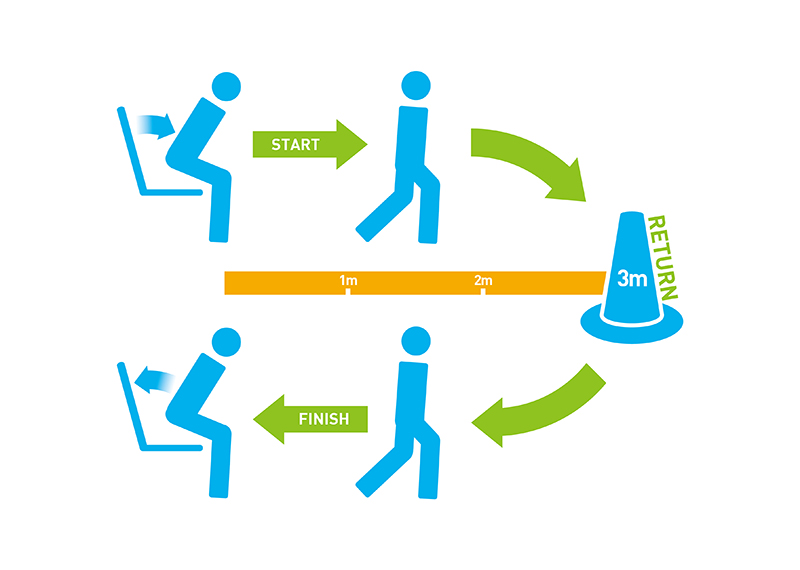 ‘일어나 걸어가기’ 검사는 의자에서 일어나 3m를 걷고 다시 돌아와 앉기까지 걸리는 시간을 측정하는 것으로 이를 통해 다리 근력, 보행속도, 균형감각 등을 종합적으로 판단할 수 있다.