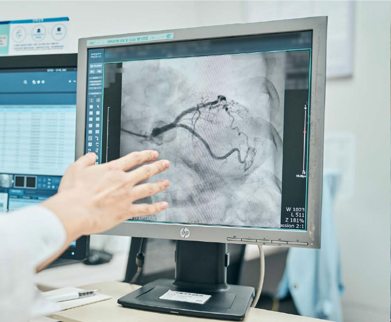 A. 환자분들 이야기를 듣다 보면 흔히 있는 일입니다.저는 의사와 환자는 함께 치료 방향을 고민하고 결정하고 걸어가는 동반자라고 생각해요. 그래서 진료실에서는 제가 가진 의학적 지식과 정보를 최대한 이해하기 쉽게 설명 드리고, 환자분이 자신의 상태를 충분히 파악한 후 스스로 결정에 참여하실 수 있게 합니다. 저뿐 아니라 저희 진료과 교수님들께서 환자분들과 함께 모니터를 보시는 이유도 그 때문이죠. 어디가 좁아졌다가 넓어졌는지 직접 확인하면 훨씬 쉽게 이해하시니까요. 특히 심혈관 질환을 가진 환자들은 흔히 ‘가슴이 아프다’라고 표현하시는데, 이 증상은 평범하다면 평범할 수 있는 것이라서 잘 파악해야 해요.언제, 어떤 상황에서 가슴이 아픈지 주변 환경은 어떤지를 알아야 정말 심장 때문인지, 심장 문제라면 얼마나 위급한지를 판단할 수 있어요. 진료가 지연되면 다음 분들이 불만을 가지실 수도 있지만, 그분들도 경청하는 모습을 보시면 이해해 주시더라고요.