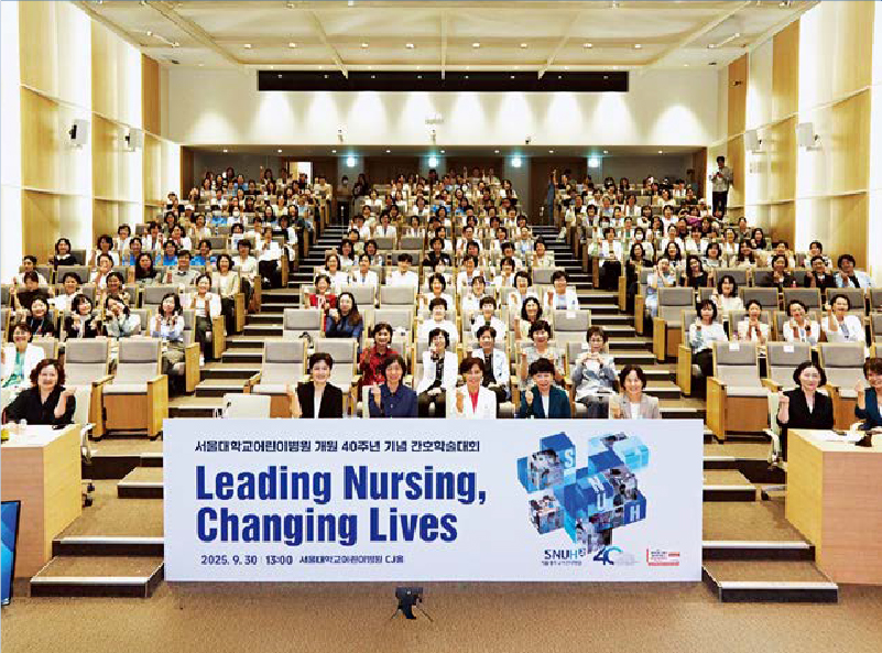 9월 30일 어린이병원 개원 40주년을 기념해‘Leading Nursing, Changing Lives’를 주제로 간호학술대회가 열렸다. 이번 학술대회에서는 서울대학교병원의 아동간호 역사를 돌아보고 최신연구를 공유하며 간호서비스 질 향상 등 미래 발전방향을 살펴보았다. 특히 ▲중증소아환자·가족과 유대감을 형성하고 정서적 지원을 제공한 성과 ▲미국 아동간호 모델을 바탕으로 한 한국 아동간호 성장 로드맵 ▲아동병동 간호·간병통합서비스 제공을 위한 간호인력 배치수준 ▲소아맞춤형 디지털기술 개발과 소아전문 간호교육과정 세분화 등 과제와 비전 등을 다루었다.