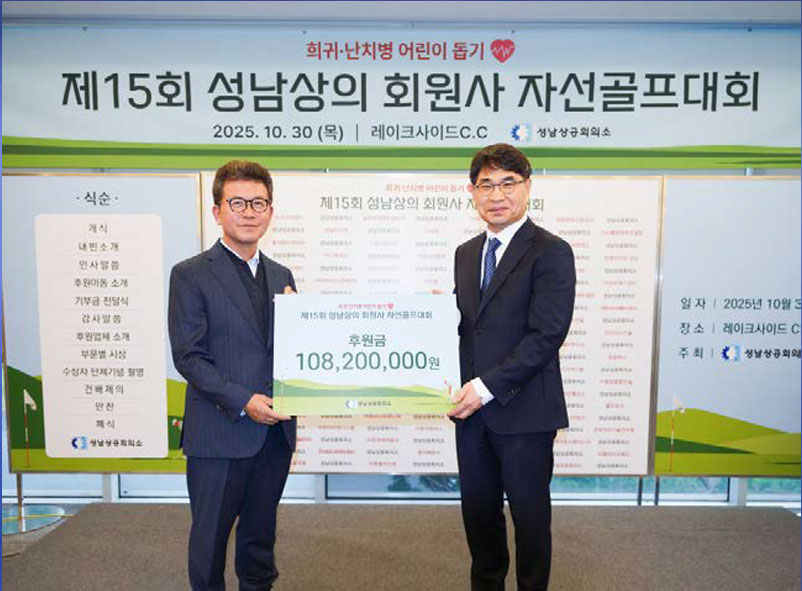 성남상공회의소가 10월 30일 제15회 회원사 자선골프대회를 열고, 1억 1천 2백 80만 원을 분당서울대학교병원에 기부했다. 후원금은 희귀·난치병을 앓는 어린이들의 수술과 치료비로 전액 사용될 예정이다. 전영태 분당서울대학교병원 진료부원장은 “기업인들의 따뜻한 마음으로 모아진 성금이 난치병을 앓고 있는 어린이들이 건강을 되찾는 데 큰 힘이 될 것”이라고 말했다. 정영배 성남상의 회장은 “어려운 경제 환경 속에서도 회원사들의 열정적인 참여 덕분에 역대 최고액의 성금이 모였다”라며, “이번 성금이 고통받고 있는 어린이들에게 새로운 희망을 전하는 씨앗이 되길 바란다”라고 말했다.